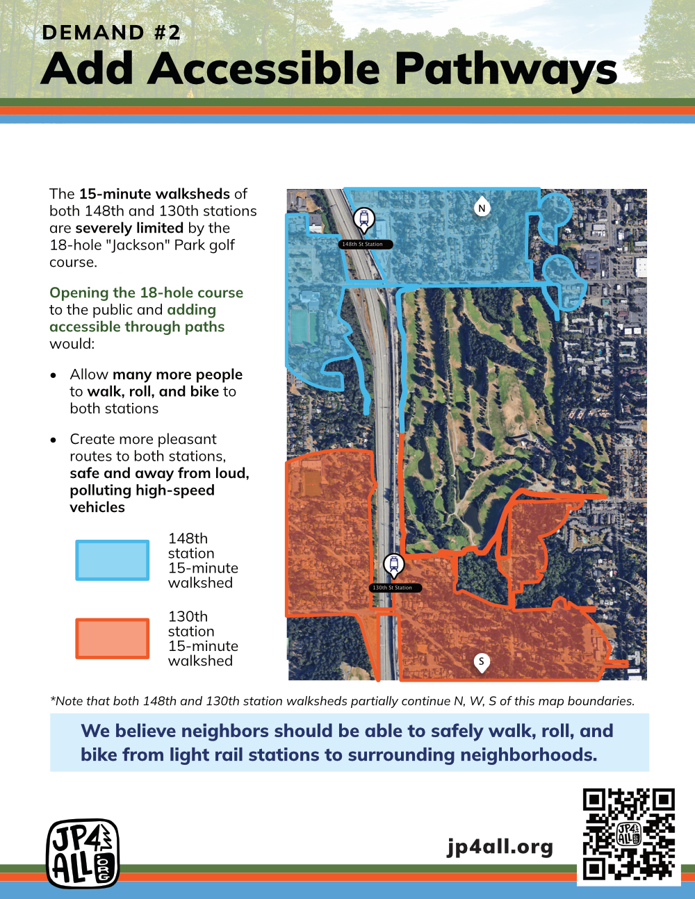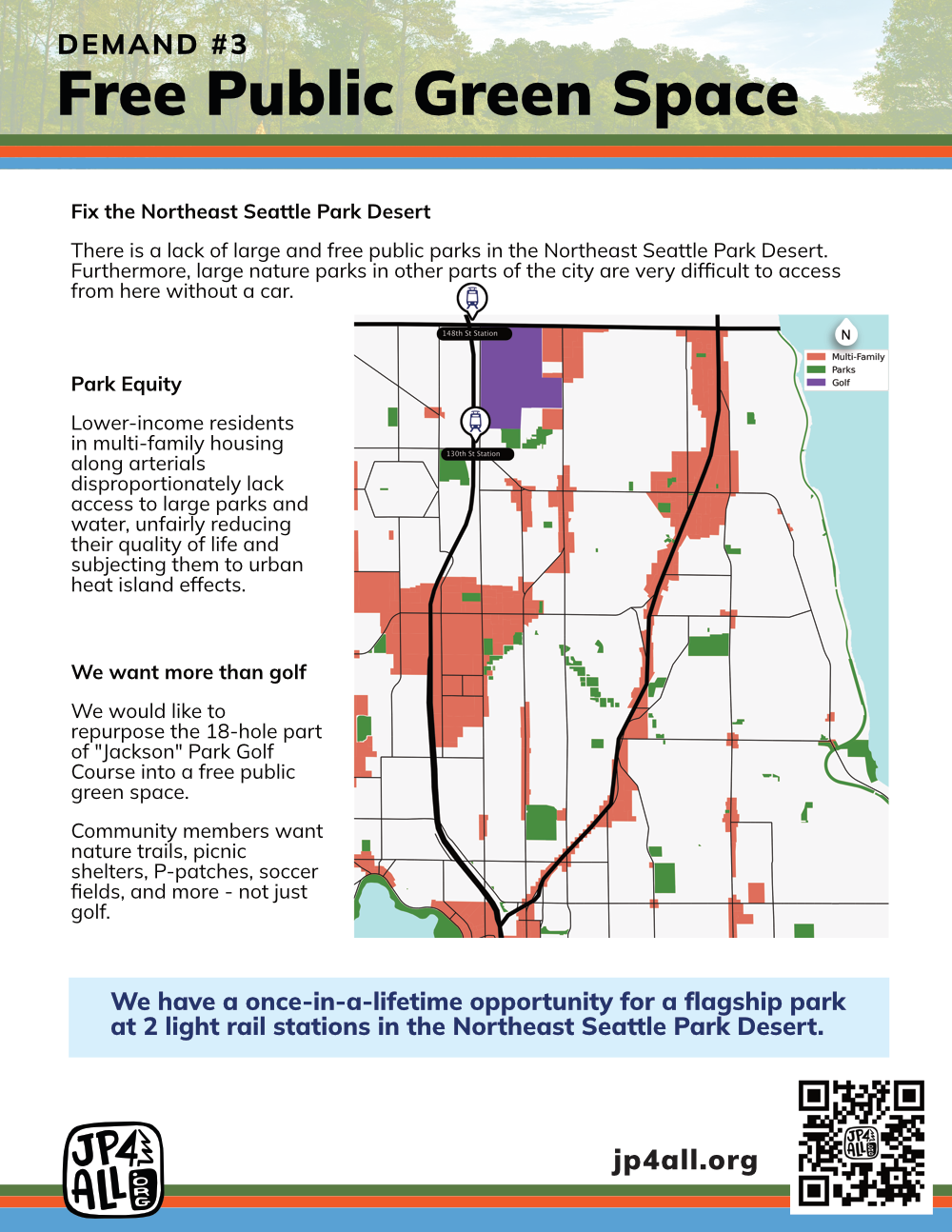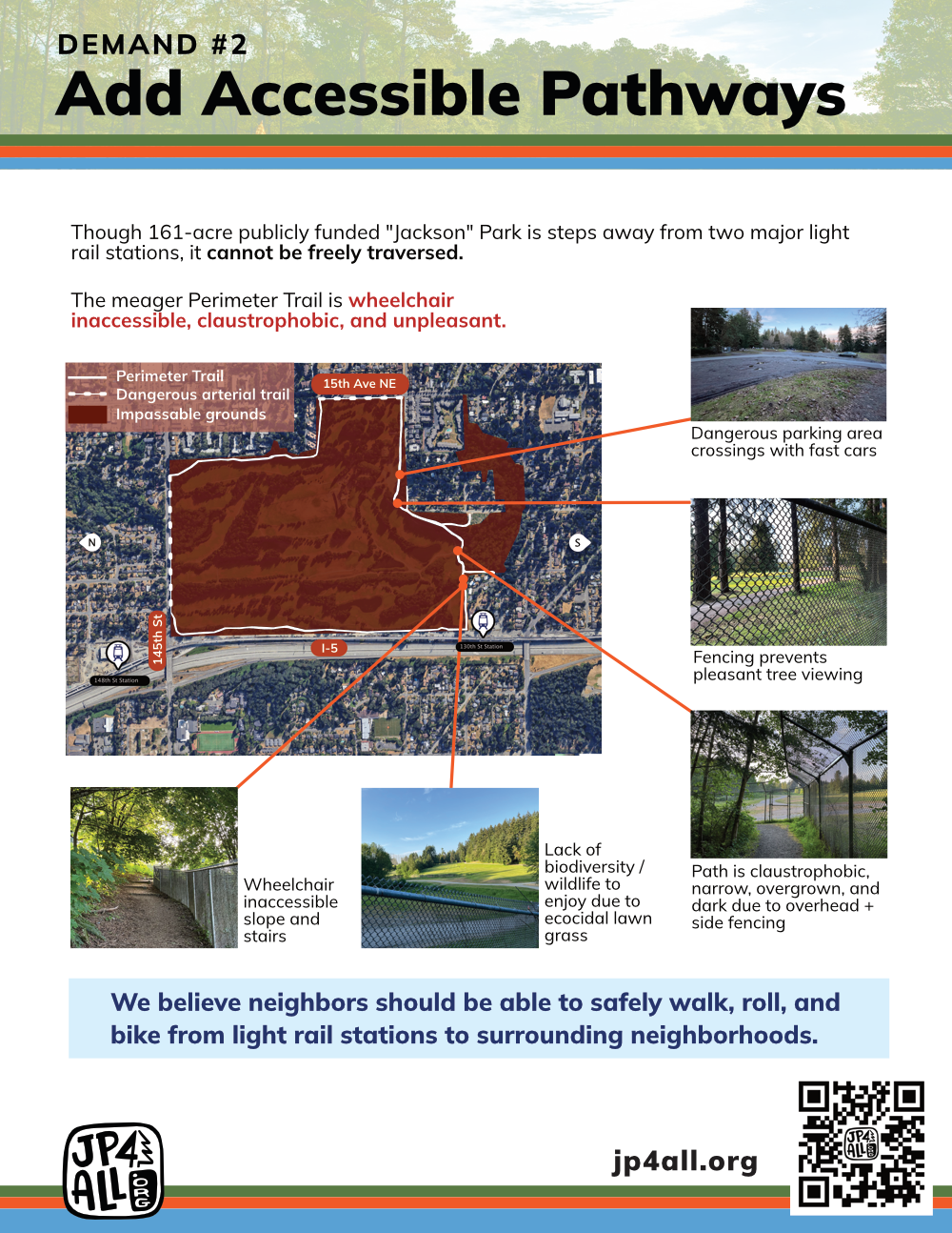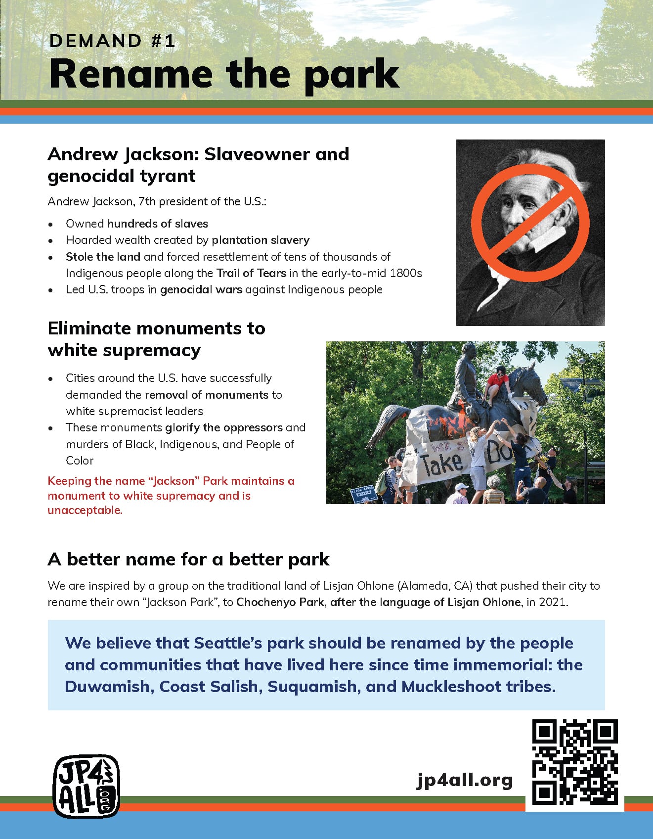 Our informational flyers: Demand #1: Rename the park. Andrew Jackson: Slaveowner and genocidal tyrant. Eliminate monuments to white supremacy. A better name for a better park. Demand #2: Add Accessible Pathways. The meager Perimeter Trail is wheelchair inaccessible, claustrophobic, and unpleasant. Add Accessible Pathways. Allow many more people to walk, roll, and bike to both stations. Demand #3: Free Public Green Space. Fix the Northeast Seattle Park Desert. Park Equity. We want more than golf.